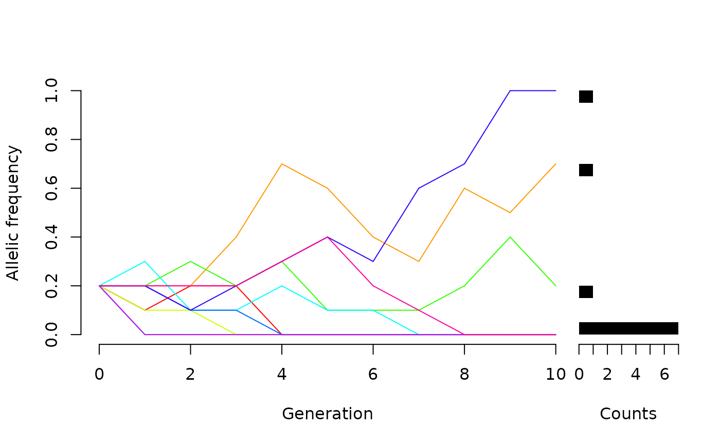 WFDriftSim(Ne = 5, n.gen = 10, knitr = TRUE)
