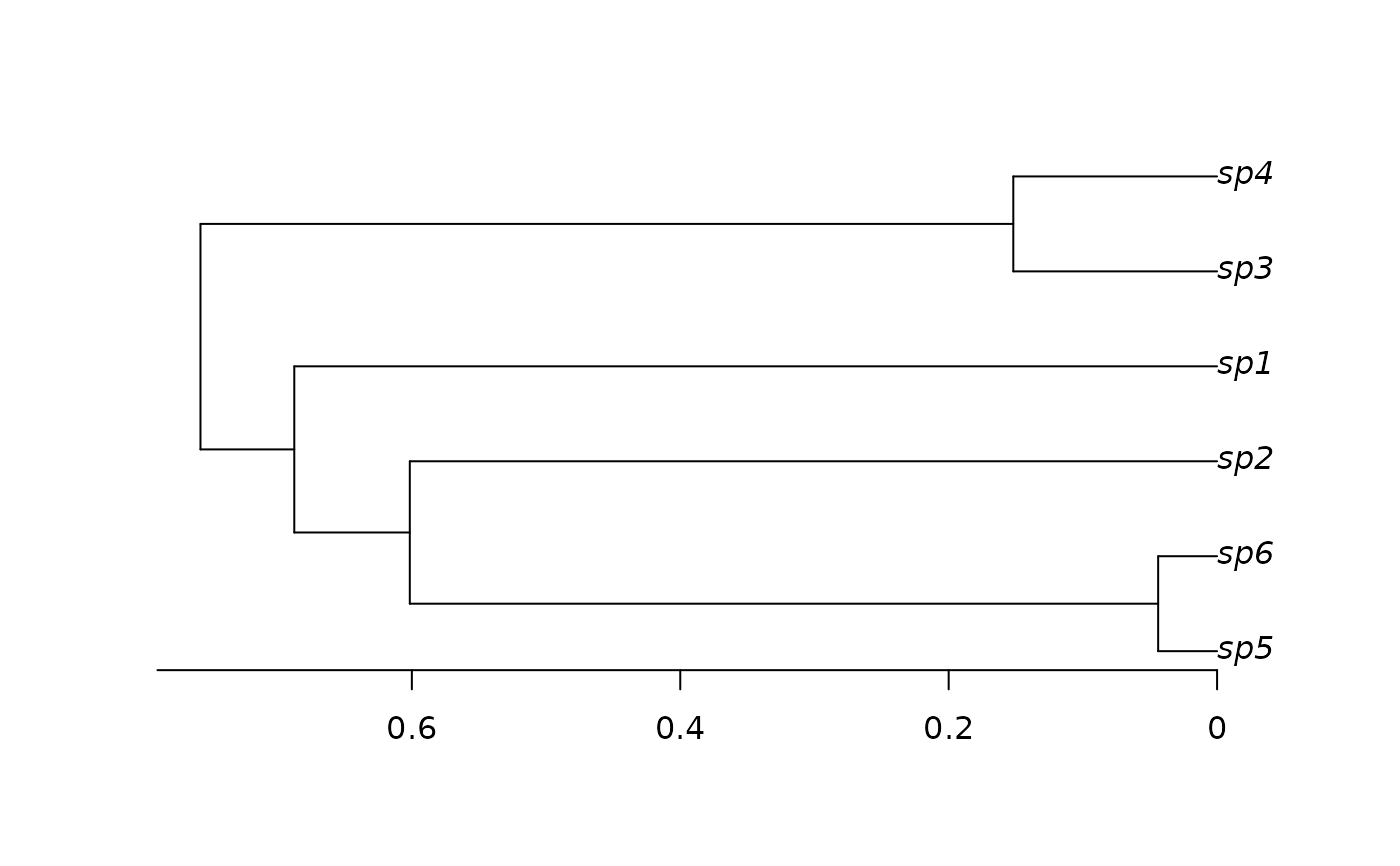 phy <- simulateTree(pars = c(S, E), max.taxa = 6, max.t=Inf)